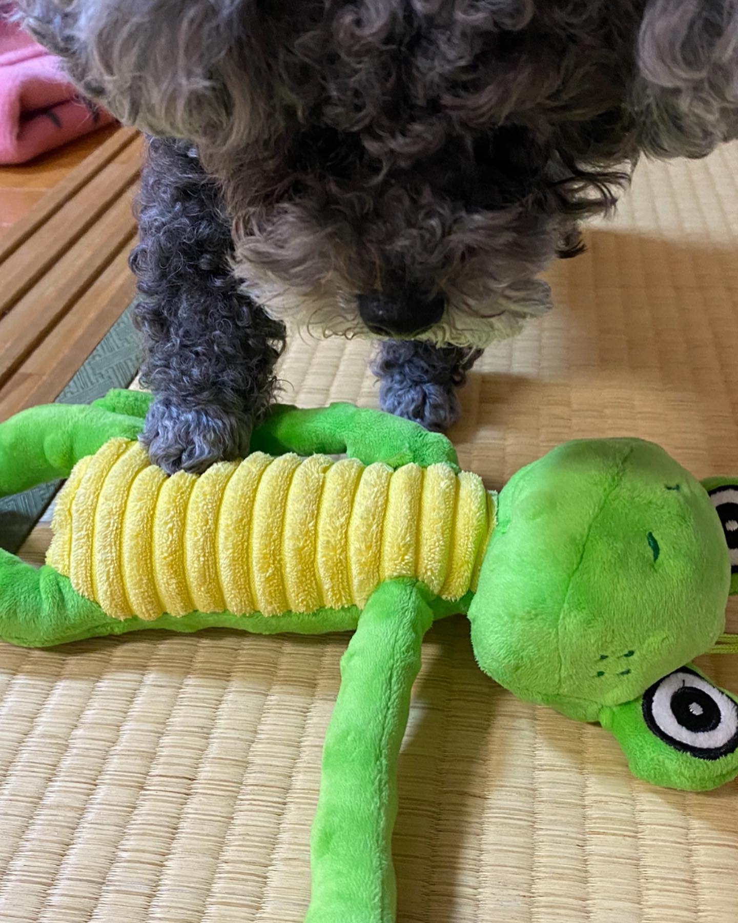 ①何か踏んづけたと思ったらブー!って音がしたの。カエルさんのお腹を踏んじゃってたのね。面白くてまた踏んづけて…。